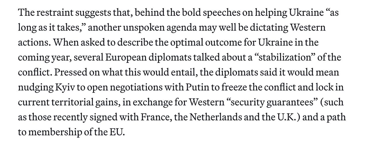 "Когда некоторых европейских дипломатов попросили описать оптимальный исход для Украины в наступающем году, они говорили о "стабилизации" конфликта. На вопрос о том, что это повлечет за собой, дипломаты заявили, что это будет означать подталкивание Киева к началу переговоров с Путиным, чтобы заморозить конфликт и зафиксировать текущие территориальные приобретения в обмен на западные "гарантии безопасности" (например, те, которые недавно были подписаны с Францией, Германией и Великобританией - Ред.) и путь к членству в ЕС", - пишет издание.