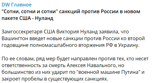 Ранее в Белом доме говорили, что Вашингтон планирует в пятницу, 23 февраля, обнародовать новый пакет санкций в отношении РФ в связи со смертью оппозиционера Алексея Навального.