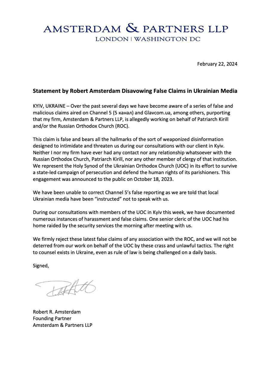 Как говорится в распространенном сегодня обращении Роберта Амстердама, сообщения некоторых украинских СМИ о том, что он якобы работает от имени патриарха Кирилла и Русской православной церкви (РПЦ), являются ложью и попыткой запугивания.