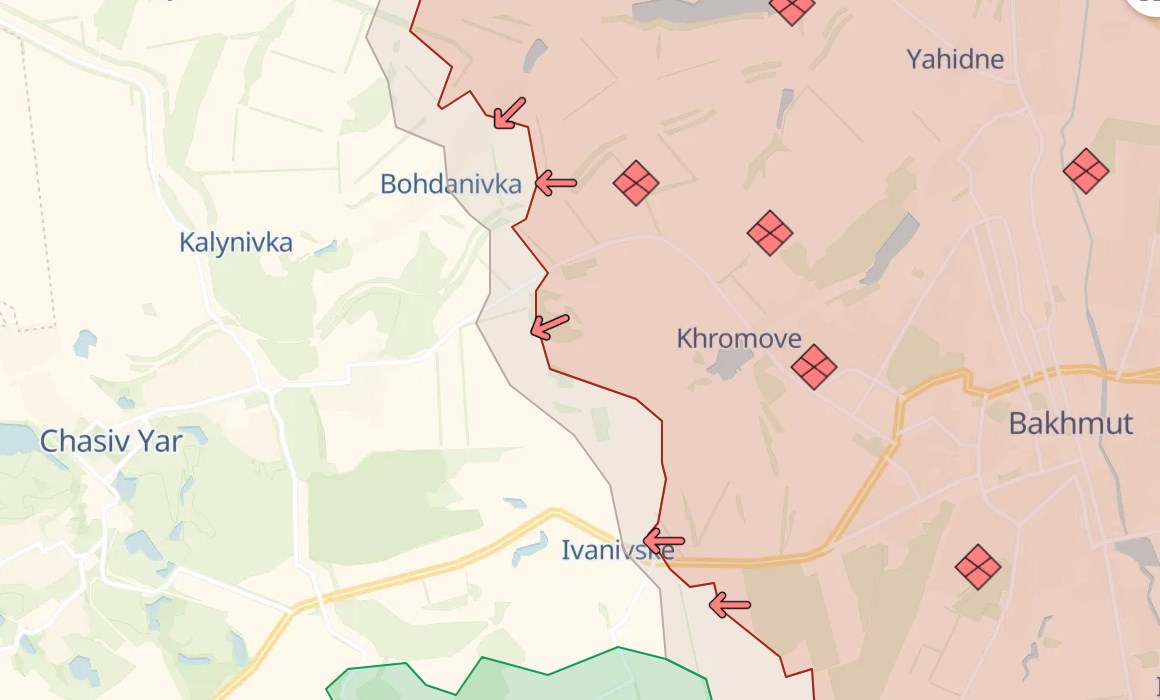 Украинские паблики сообщают, что российские войска продвинулись в селе Ивановское под Бахмутом. Оно расположено на дороге в Часов Яр.