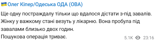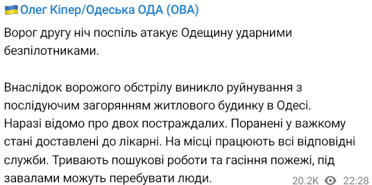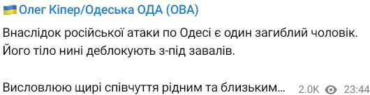 Об этом сообщил глава Одесской областной военной администрации Олег Кипер в своем телеграм-канале.