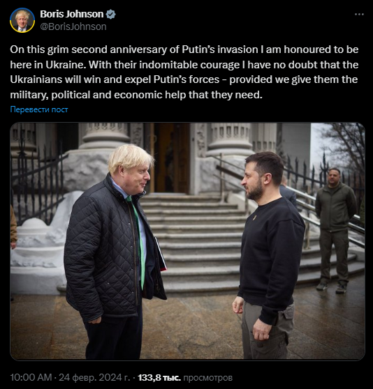 Экс-премьер Британии Борис Джонсон сделал пост о своём визите в Киев 24 февраля во вторую годовщину широкомасштабного вторжения РФ в Украину.