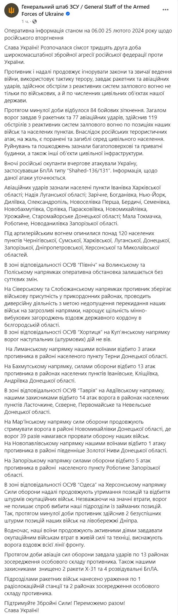 08:40 За прошедшие сутки произошло 84 боевых столкновения. Всего враг нанес 9 ракетных и 77 авиационных ударов, совершил 119 обстрелов из РСЗО по позициям наших войск и населенным пунктам.
