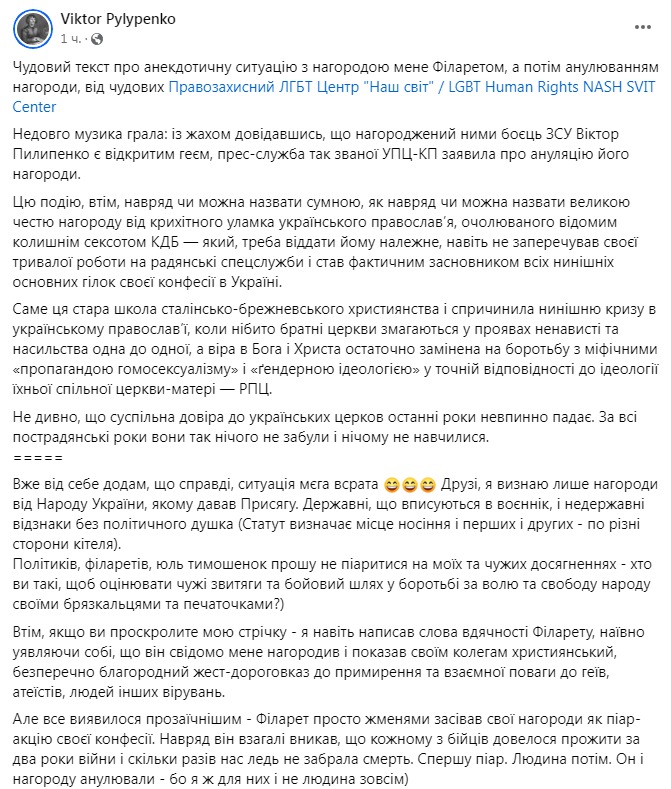 Получив награду, Пилипенко написал пост в Фейсбуке, в котором поблагодарил Филарета и Киевский патриархат за "кардинальную" смену позиции относительно ЛГБТ.
