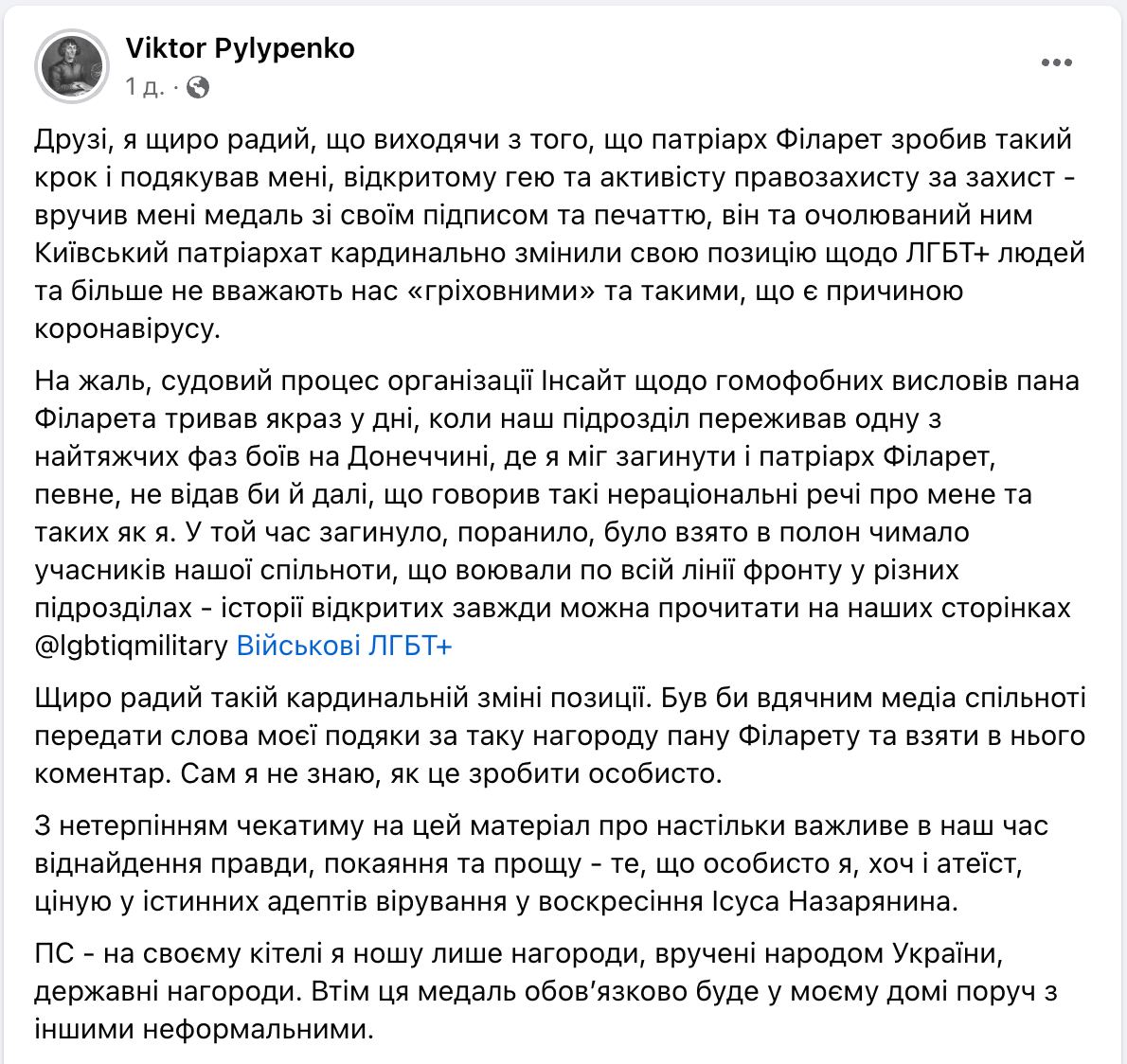 "Друзья, я искренне рад, что исходя из того, что патриарх Филарет сделал такой шаг и поблагодарил меня, открытого гея и активиста правозащиты – вручил мне медаль со своей подписью и печатью, он и возглавляемый им киевский патриархат кардинально изменили свою позицию по ЛГБТ + людям и больше не считают нас "греховными" и причиной коронавируса... Искренне рад такому кардинальному изменению позиции", - сказано в посте военного.