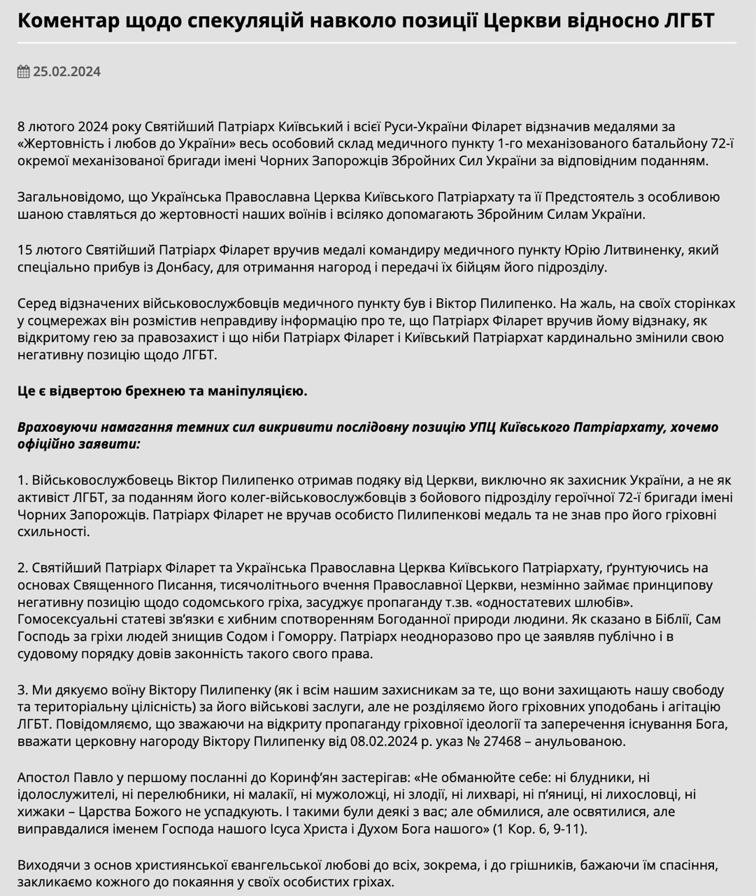 "Военнослужащий Виктор Пилипенко получил благодарность от церкви исключительно как защитник Украины, а не как активист ЛГБТ, по представлению его коллег-военнослужащих из боевого подразделения героической 72-й бригады имени Черных Запорожцев. Патриарх Филарет не вручал лично Пилипенко медаль и не знал о его греховных склонностях. Святейший патриарх Филарет и Украинская православная церковь киевского патриархата, основываясь на Священном Писании, тысячелетнем учении православной церкви, неизменно занимает принципиальную негативную позицию по отношению к содомскому греху, осуждает пропаганду т.н. "однополых браков"... Мы благодарим воина Виктора Пилипенко (как и всех наших защитников за то, что они защищают нашу свободу и территориальную целостность) за его военные заслуги, но не разделяем его греховные предпочтения и агитацию за ЛГБТ. Сообщаем, что ввиду открытой пропаганды греховной идеологии и отрицания существования Бога считать церковную награду Виктору Пилипенко от 08.02.2024 г. аннулированной", - заявили в пресс-службе киевского патриархата.