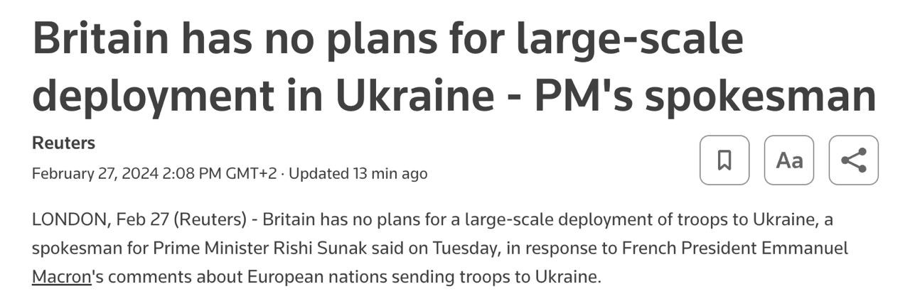 14.28 Британия не планирует "широкомасштабного развертывания войск" в Украине, заявил пресс-секретарь премьера Сунака.