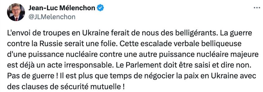 "Отправка войск в Украину сделает нас воюющей стороной. Война с Россией была бы безумием. Эта воинственная словесная эскалация одной ядерной державы против другой крупной ядерной державы уже является безответственным поступком. Необходимо попросить парламент сказать "нет". Нет войне! Настало время договориться о мире в Украине с взаимными условиями безопасности!", - написал Меланшон, который является одним из ведущих оппозиционных политиков Франции.