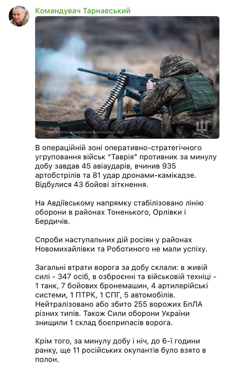 Он добавил, что в операционной зоне группировки "Таврия" противник нанес 45 авиаударов, произвел 935 артобстрелов и предпринял 81 удар дронами-камикадзе. Произошли 43 боевых столкновения.