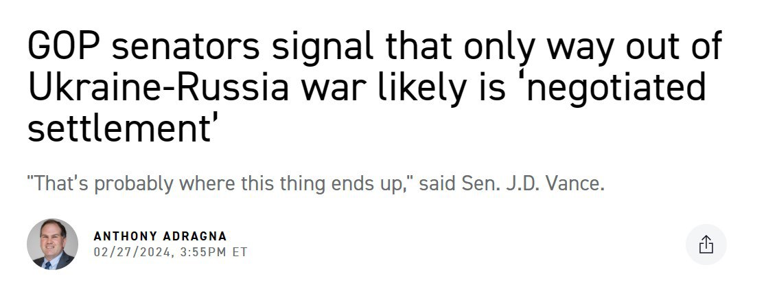 В свою очередь сенатор от Огайо Ди Вэнс выразил похожую точку зрения. По его словам, сложилась "патовая ситуация, вероятно, на неопределенный срок". Политик понадеялся, что "это приведет к какому-то урегулированию, при котором Украина сможет сохранить свою страну и убийства прекратятся".