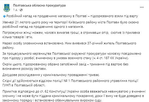 При процессуальном руководстве Полтавской окружной прокуратуры мужчине сообщено о подозрении в разбое, совершенном в условиях военного положения (ч. 4 ст. 187 УК Украины).