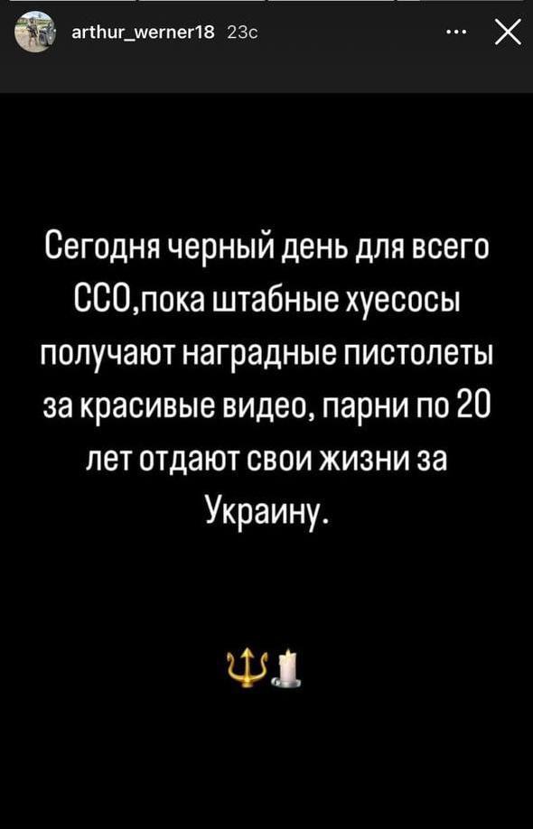 "Сегодня черный день для всего ССО. Пока штабные х@есосы получают наградные пистолеты за красивые видео, парни 20 лет отдают свои жизни за Украину", - сказано в одном из постов.
