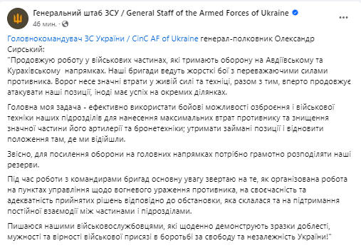 "Главная моя задача - эффективно использовать боевые возможности вооружения и военной техники наших подразделений для нанесения максимальных потерь противнику и уничтожения значительной части его артиллерии и бронетехники; удержать занимаемые позиции и восстановить положение там, где мы отошли", - пишет Сырский.