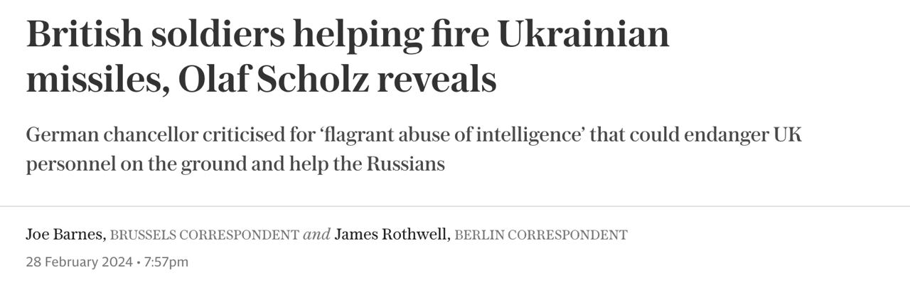 Газета цитирует заявление Шольца, который сказал в понедельник, что он не будет поставлять ВСУ дальнобойные ракеты Taurus, берлинский эквивалент Storm Shadow, поскольку для этого потребуется помощь немецких военных "на земле" (то есть на территории Украины). И добавил, что так уже делают британские и французские воынные со Storm Shadow. Шольц сказал, что именно по этой причине не хочет поставлять Taurus, так как Германия тогда станет "участником войны".