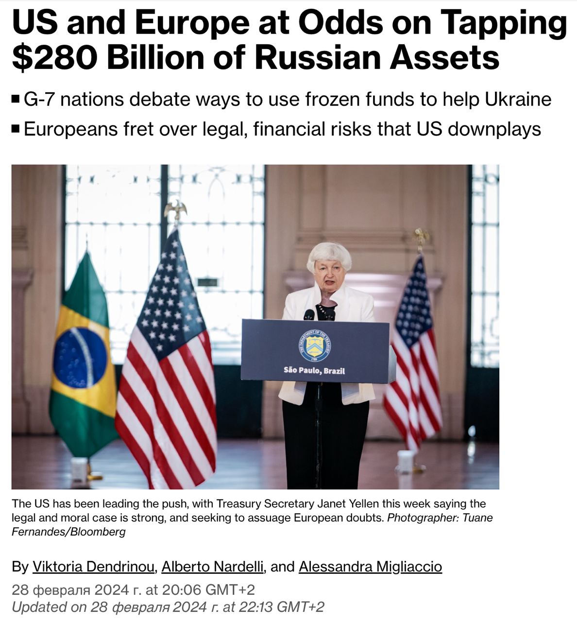 Напомним, основной держатель замороженных российских активов на Западе, бельгийский инвестиционный фонд Euroclear, тоже выступил против плана стран G7 ("Большой семерки") по использованию этих денег. Компания удерживает 191 миллиард долларов замороженных активов центробанка РФ из 260.
