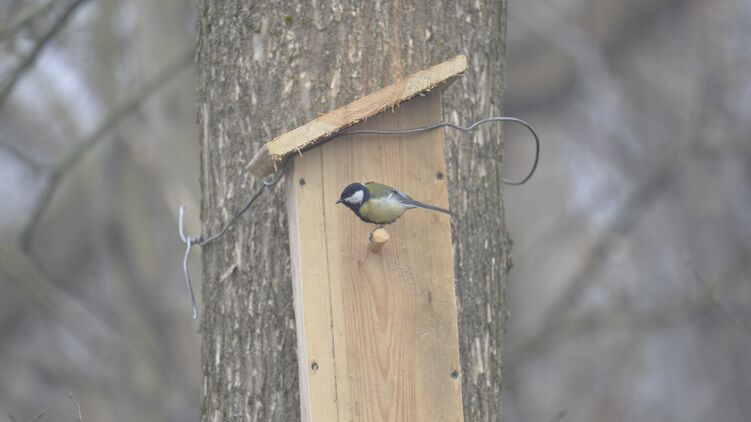 Но чтобы отложить яйца и спокойно вывести птенцов, пернатым крохам нужен дом. На снимке синичка как раз присматривается к такому – деревянному и надежному.