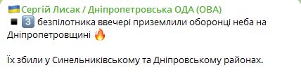 07.40 Вечером в Днепропетровской области сбили три беспилотника - в Синельниковском и Днепровском районах.