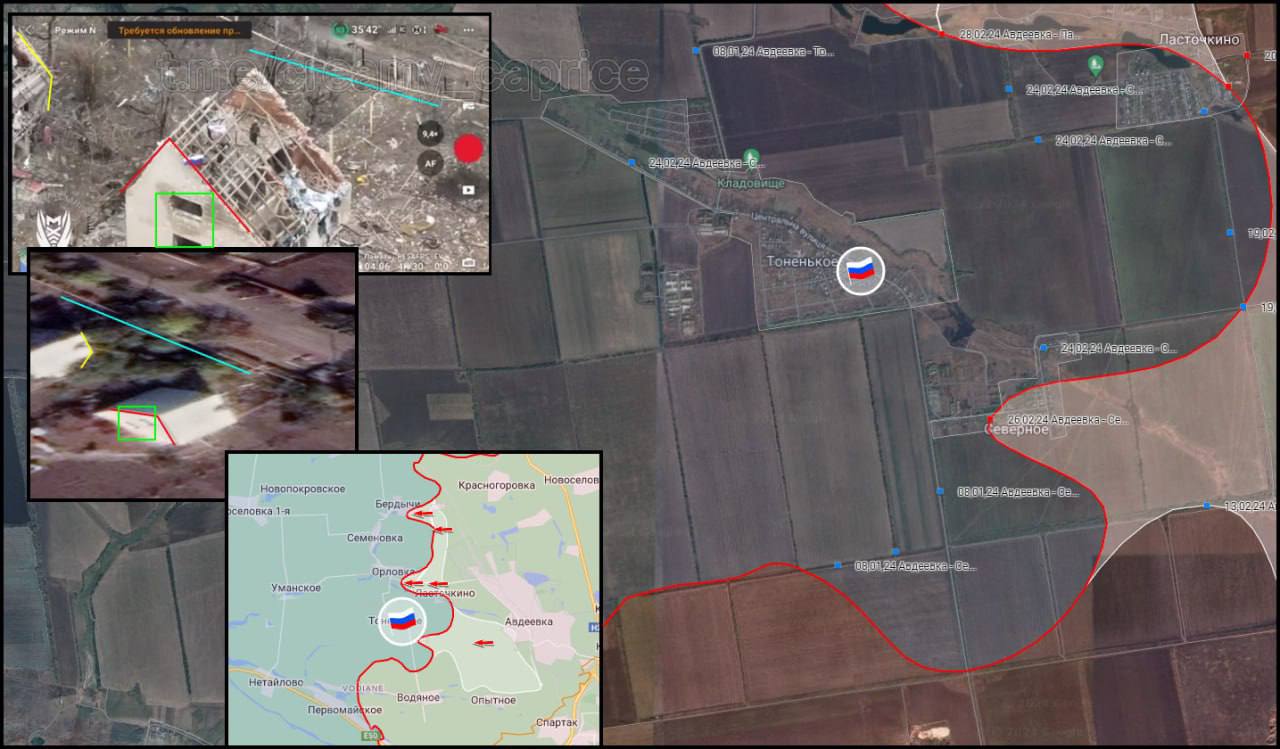 Российские телеграм-каналы заявляют о захвате Тоненького к западу от Авдеевки и к югу от Орловки, куда уже вошли российские войска. Украина этого не подтверждала.
