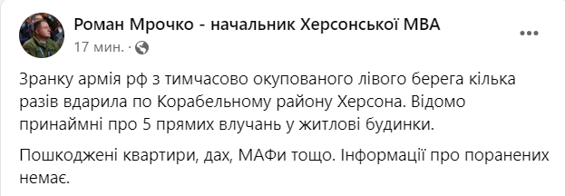 Сегодня утром армия РФ с временно оккупированного левого берега несколько раз ударила по Корабельному району Херсона.