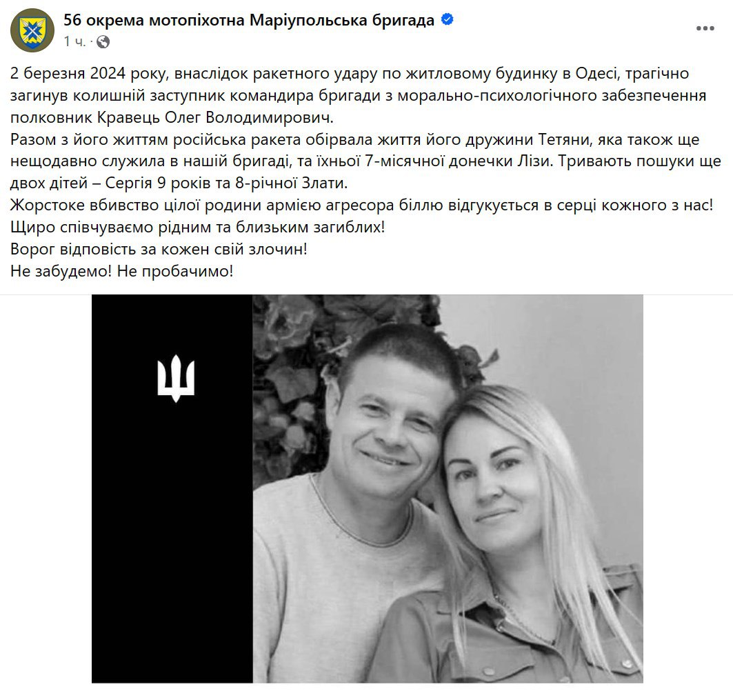 Погибший после удара по дому в Одессе полковник Олег Кравец был бывшим заместителем командира 56-й отдельной мотопехотной бригады ВСУ.