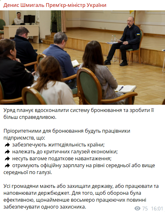 По состоянию на март 2024 года бронь от мобилизации имеют около 700 тыс. человек. Шмыгаль отметил, что восемь работающих должны обеспечивать одного военного на фронте.