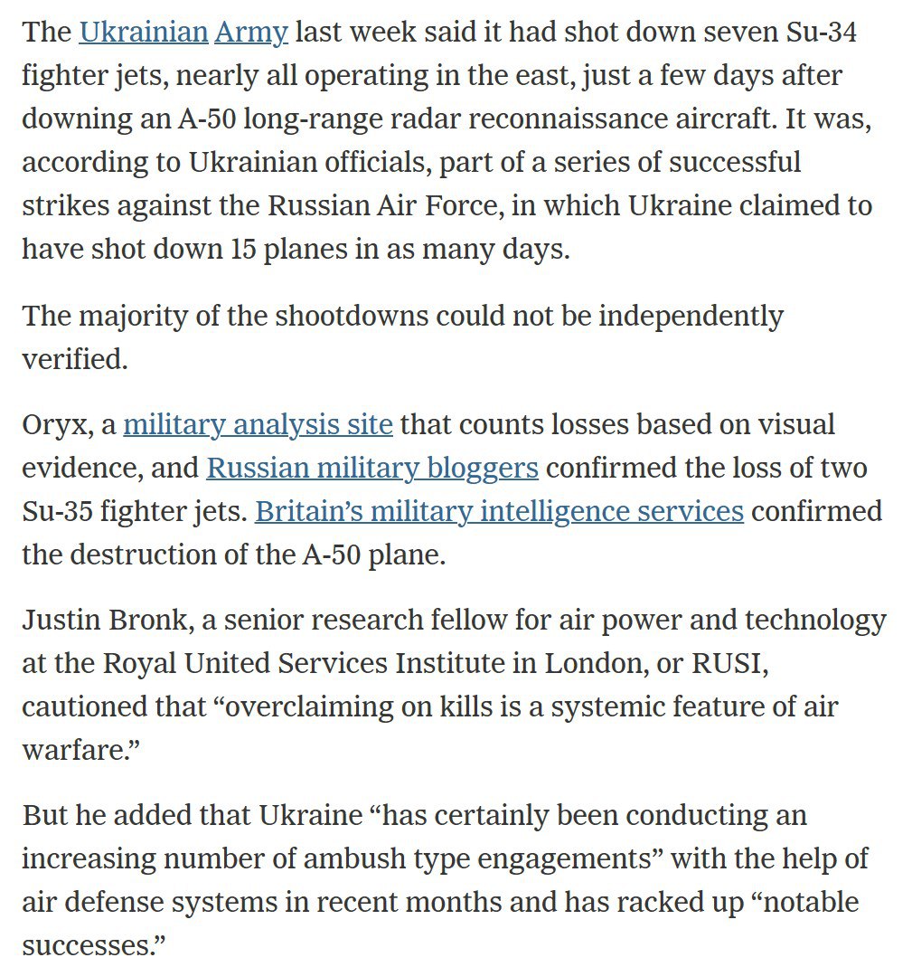 NYT со ссылкой на западных OSINT-аналитиков и российских военных блогеров пишет о том, что объективно подтверждаются только поражения двух Су-35 и одного А-50.