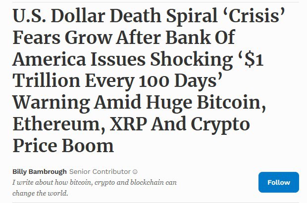 Forbes пишет, что рекордный рост курса биткоина и других криптовалют является плохим знаком для доллара