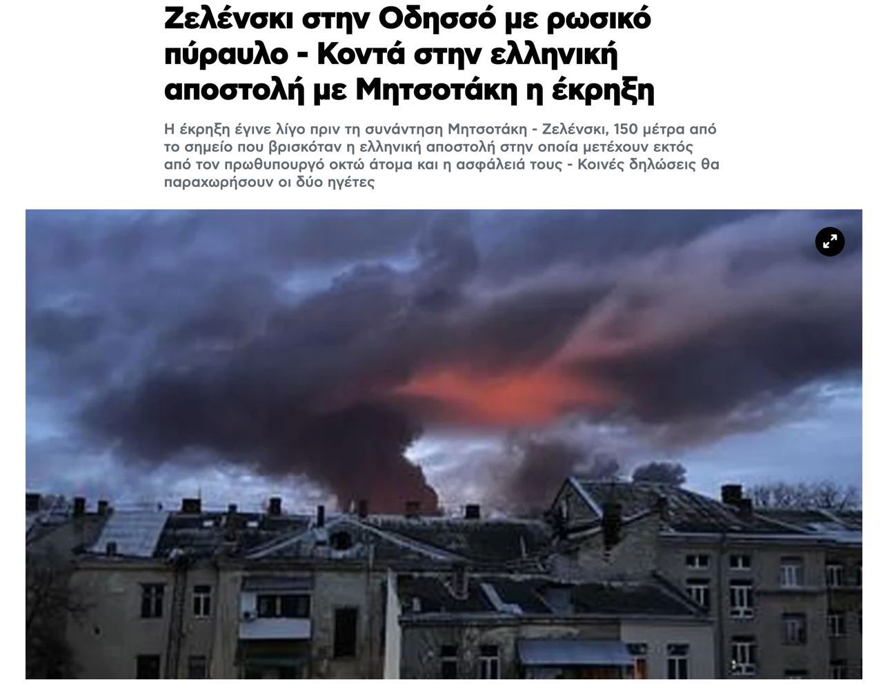 Как пишут греческие СМИ, взрыв произошел незадолго до встречи между премьером Греции Мицотакисом и Зеленским, в 150 метрах от того места, где располагалась греческая миссия, в которой, помимо премьер-министра, были восемь человек и их охрана.
