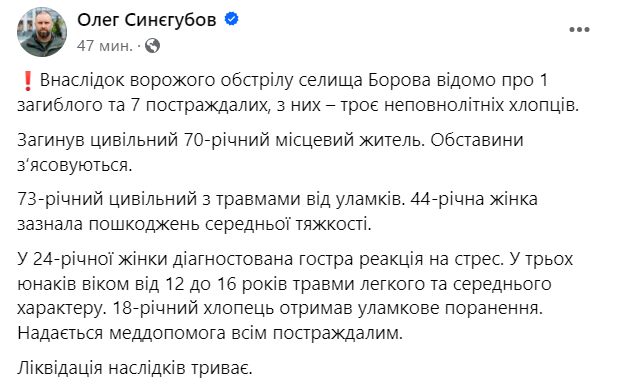 Об этом сообщает глава Харьковской ОВА Олег Синегубов.