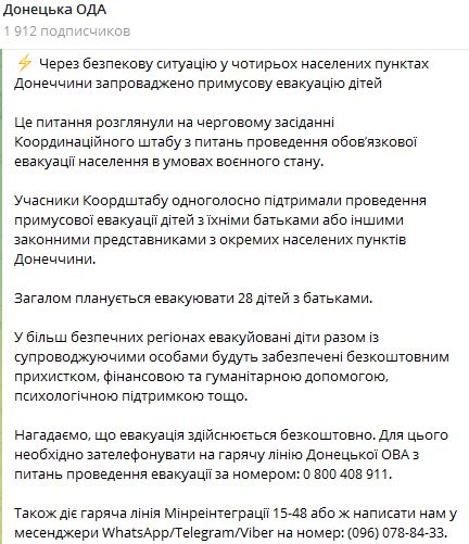 А также, что в Донецкой области объявили принудительную эвакуацию детей из двух громад.