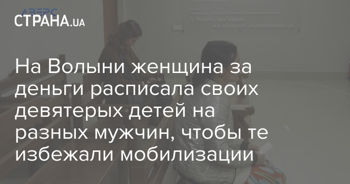 На Волыни многодетная мать за вознаграждение записала своих девятерых детей на разных мужчин, чтобы последние смогли избежать мобилизации. На суде она заверяла, что сделала это по собственной инициативе, переживая, чтобы мужчин "не забрали на войну". Однако при этом не смогла вспомнить имена всех "гражданских мужей".