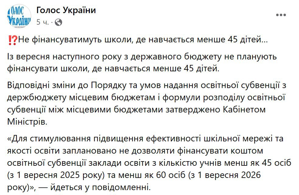 С сентября 2025 года из государственного бюджета Украины не планируют финансировать школы, в которых учатся менее 45 детей.