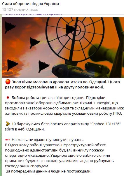 Всего над областью сбили десять дронов, сообщили Силы обороны юга Украины.
