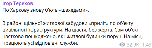 Кроме того, глава Харьковской областной военной администрации Олег Синегубов сообщил, что помимо объекта инфраструктуры под удар "Шахеда" попала гостиница. Также повреждены авто и здание коммунального учреждения.