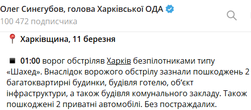 Ночью 11 марта в Харькове беспилотник "Шахед" ударил по объекту гражданской инфраструктуры.