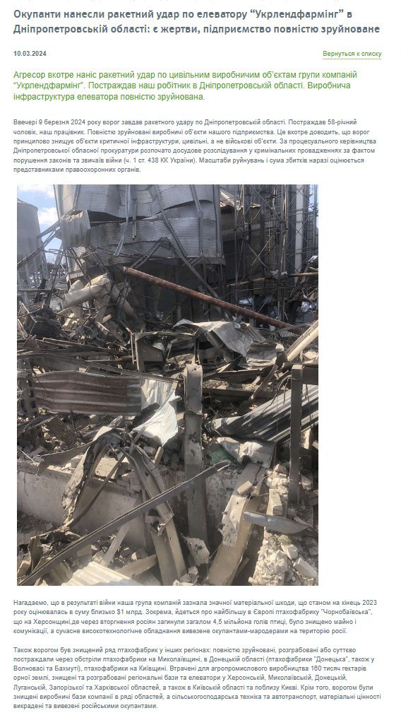 Армия РФ вечером 9 марта нанесла ракетный удар по элеватору в Днепропетровской области, полностью разрушив предприятие.