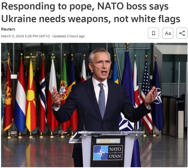 Генеральный секретарь НАТО Йенс Столтенберг, не согласившийся с идеей папы римского о необходимости начала переговоров между Киевом и Москвой, заявил, что Североатлантический альянс не планирует направлять войска в Украину, и посоветовал президенту Франции Эмманюэлю Макрону консультироваться по важным вопросам с Альянсом и его членами.