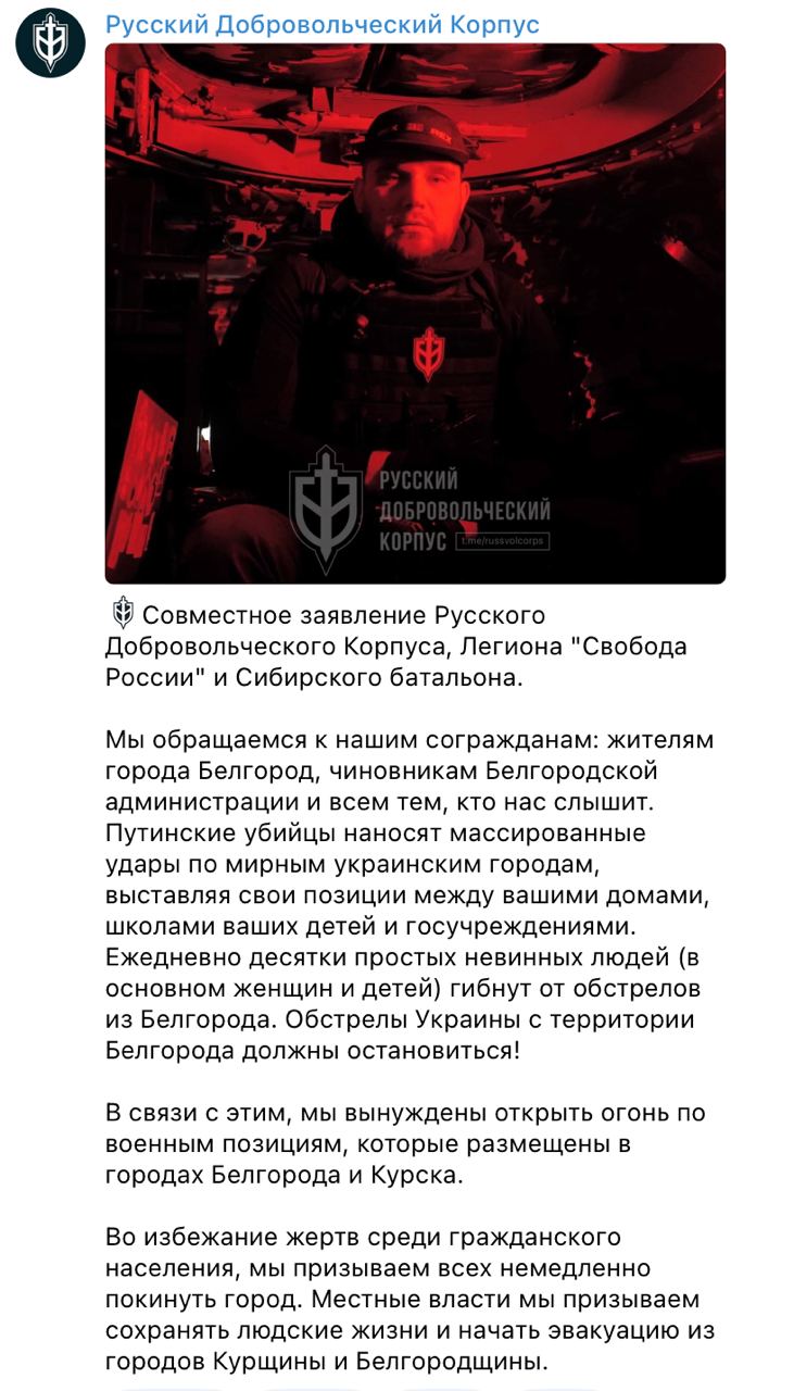 Воюющие на стороне Украины Русский Добровольческий Корпус, Легион "Свобода России" и Сибирский батальон анонсировали обстрел Белгорода и Курска.
