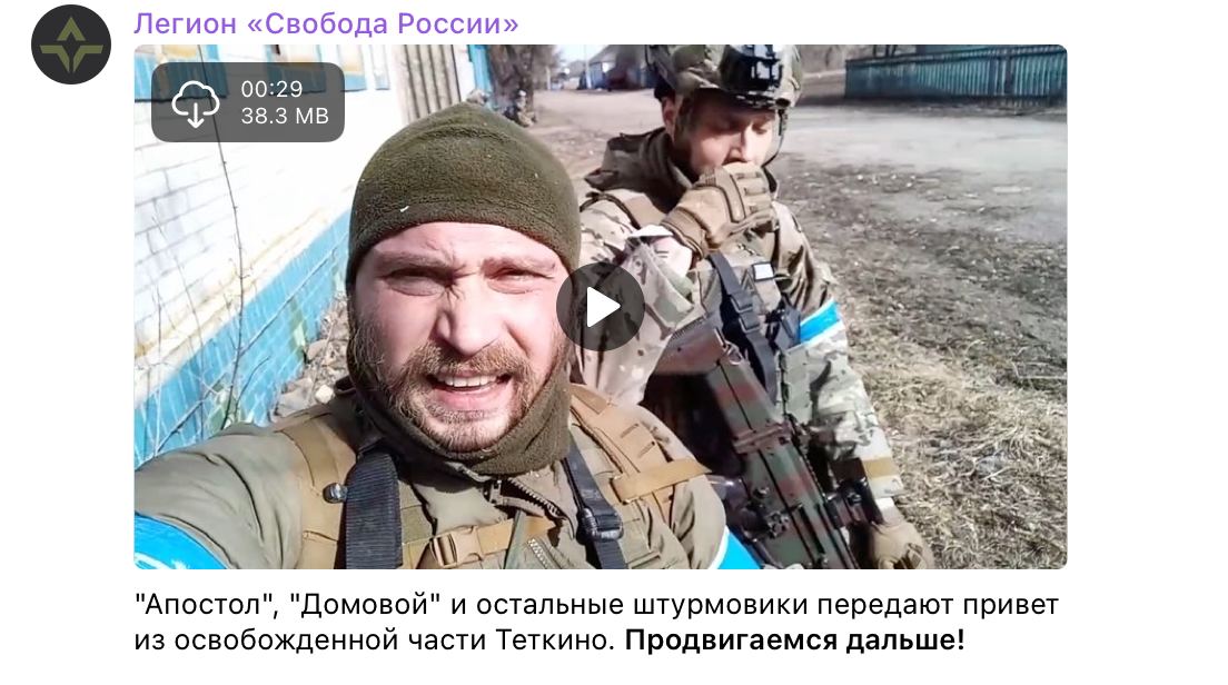 Как уже отмечалось, ролик появился в телеграм-канале "Легиона" сегодня утром, то есть почти через сутки после того, как, по утверждению "легионеров", они взяли Теткино под контроль. При этом никаких подтверждений этому до сих пор не представлено.