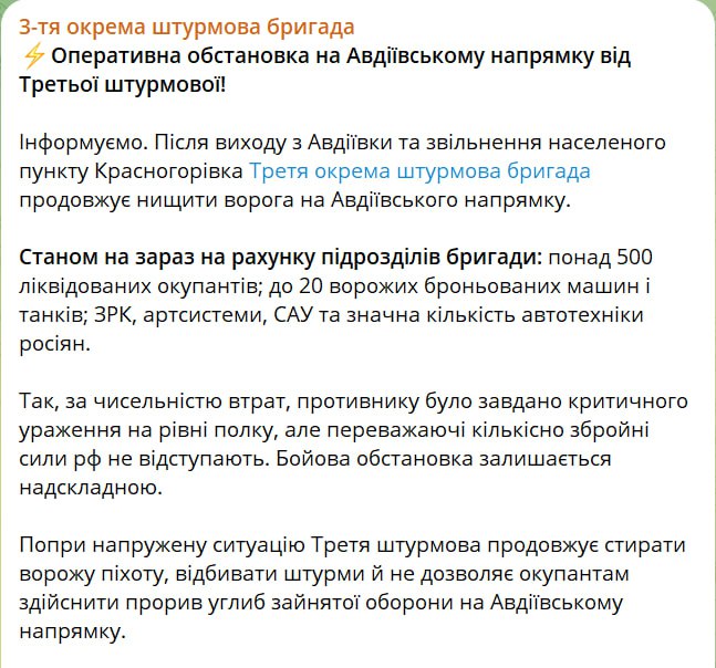 "Несмотря на напряженную ситуацию, Третья штурмовая продолжает стирать вражескую пехоту, отбивать штурмы и не позволяет оккупантам совершить прорыв вглубь занятой обороны на Авдеевском направлении", - сообщает бригада.