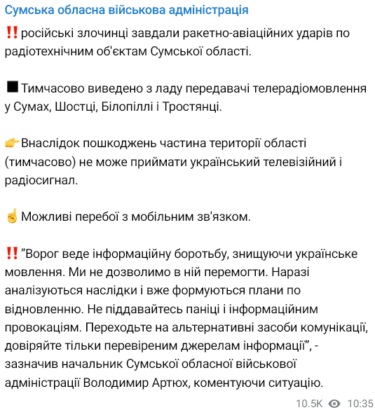 Ракетными обстрелами выведены из строя передатчики телерадиовещания в Сумах, Шостке, Белополье и Тростянце, заявляют в ОВА.