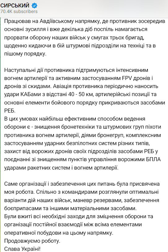 Об этом сообщил главнокомандующий ВСУ Александр Сырский после поездки под Авдеевку.