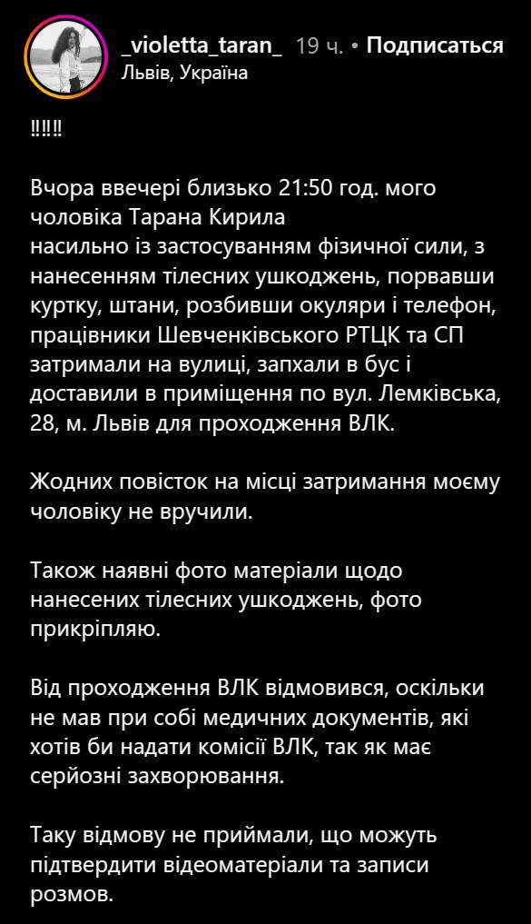 Сделали это представители Шевченковского ТЦК Львова. После доставки на медкомиссию, Таран отказался ее проходить, так как имеет серьезные заболевания, и для их подтверждения ему нужны были документы, которых у мужчины с собой не было.