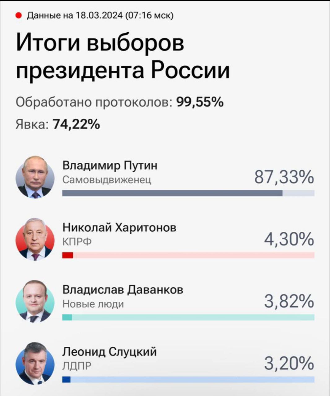 На втором месте - представитель Коммунистической партии РФ Николай Харитонов, у которого 4,30% голосов. Следом за ним идут Владислав Даванков из партии "Новые люди" (3,82%) и лидер ЛДПР Леонид Слуцкий (3,20%).