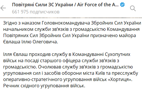 "Согласно приказу главнокомандующего Вооруженными силами Украины №480 от 15 марта 2024 года начальником службы по связям с общественностью командования Воздушных сил Вооруженных сил Украины назначен майор Евлаш Илья Олегович", – говорится в сообщении.