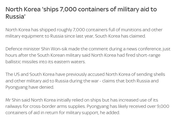 Корейская Народно-Демократическая Республика (КНДР) отправила в Россию 7 000 контейнеров с боеприпасами и другим военным оборудованием.