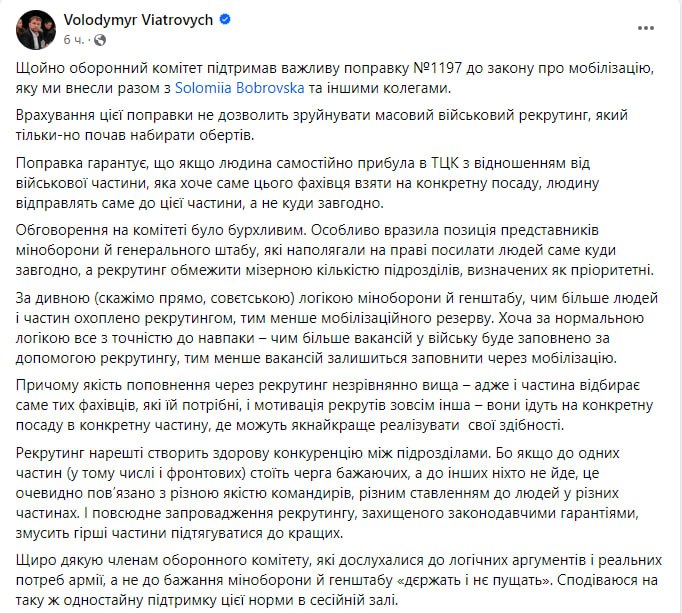 "Поправка гарантирует, что, если человек самостоятельно прибыл в ТЦК с отношением от воинской части, которая хочет именно этого специалиста взять на конкретную должность, человека отправят именно в эту часть, а не куда угодно", — написал Вятрович.