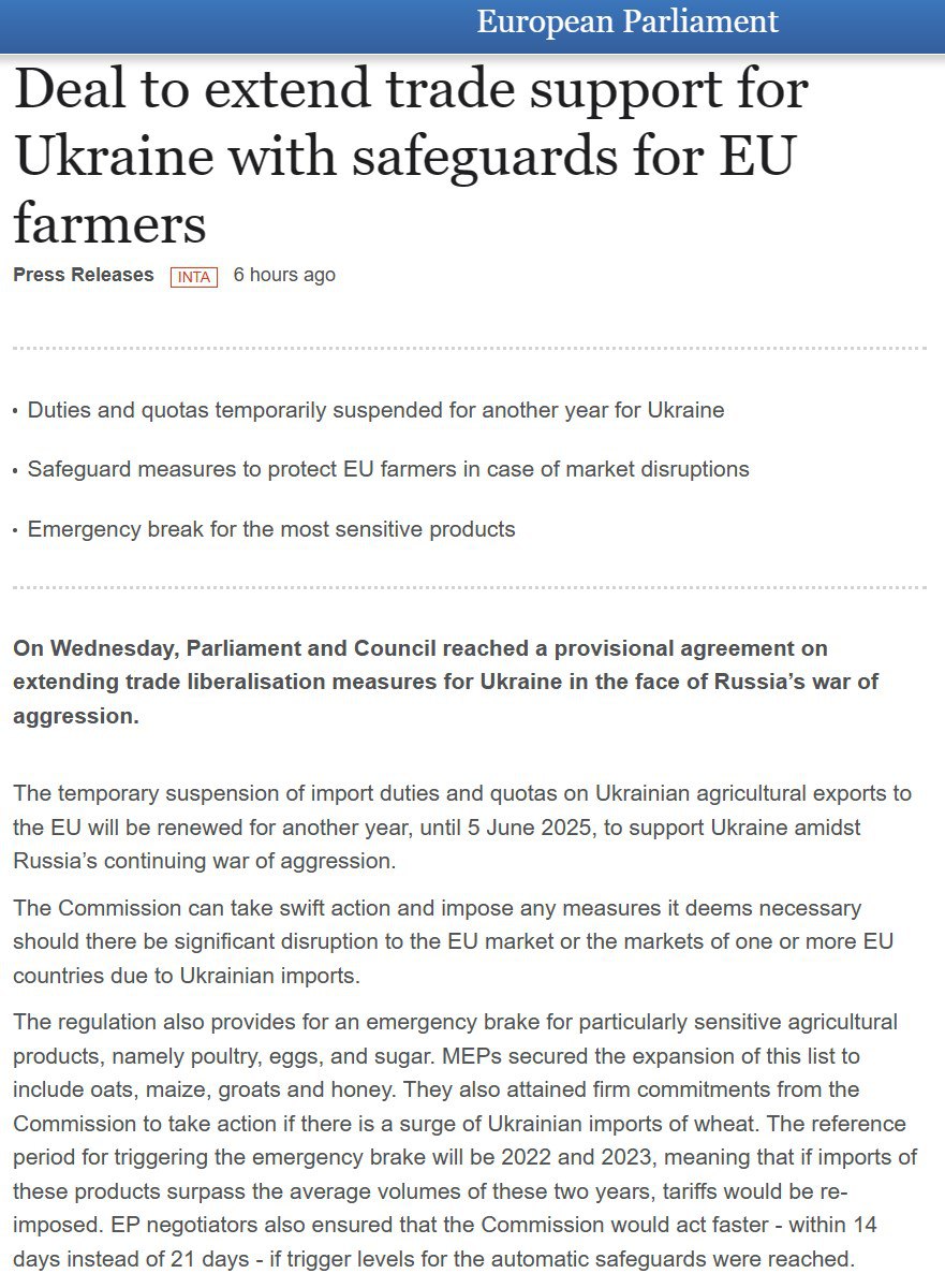 "Они также добились от Комиссии твердых обязательств принять меры в случае резкого увеличения импорта пшеницы из Украины. Базисным периодом для запуска экстренного торможения будут 2022 и 2023 годы, а это означает, что если импорт этих продуктов превысит средние объемы за эти два года, тарифы будут вновь введены", - говорится в заявлении.