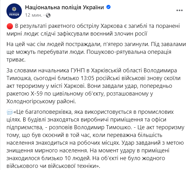 Начальник ГУНП в Харьковской области Владимир Тимошко сообщил, что сегодня около 13:05 российские военные нанесли удар, предварительно ракетой Х-59 по гражданскому объекту, расположенному в Холодногорском районе.