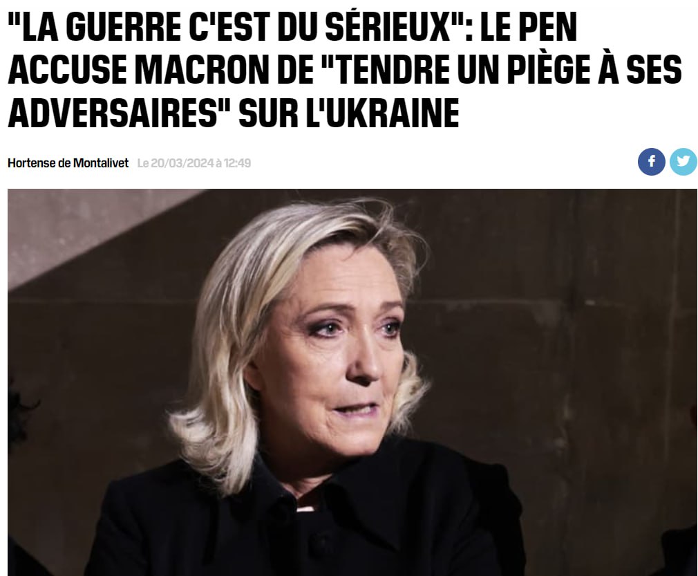 Ле Пен считает, что заявления президента Франции Макрона о возможном вводе войск в Украину сделаны в предвыборных целях (в июне пройдут выборы в Европарламент).